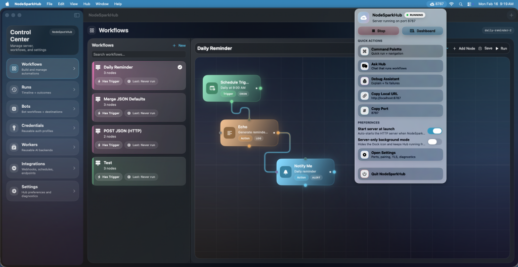 Most everything is setup to make workflow automations with ease. No Coding Experience Required. Download NodeSparkHub on macOS for a complete experience working remotely to your own server hub.